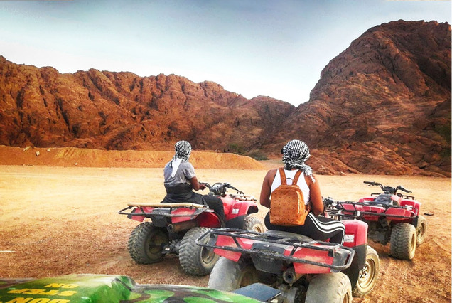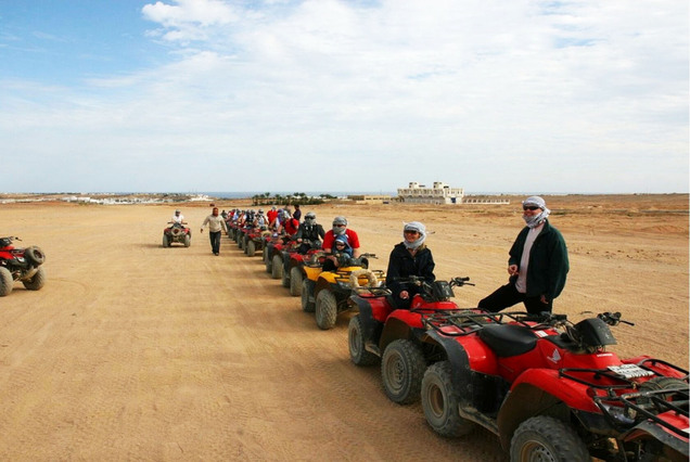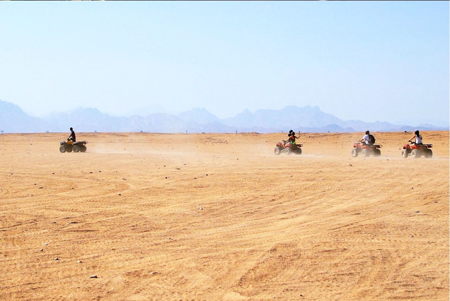 Learn how to drive a quad, then put on your gear and drive out to the desert. Discover the sandy desert and admire the surroundings with an exciting ride. Make new friends and meet some local Bedouins. Ride a camel in the desert as well. End the activity with a hotel drop-off back to Hurghada. Begin with hotel pickup. Then, set off to the desert. Listen to a quick health and safety briefing from your guide and hop onto your quad for a short driving test. After this, follow the guide out into the desert. Explore the sand and enjoy a bumpy ride while exploring your sandy surroundings. Meet some friendly Bedouins to learn about the local lifestyle. Hop onto a camel and enjoy a ride too. Finally, head back to your hotel at the end of the activity.